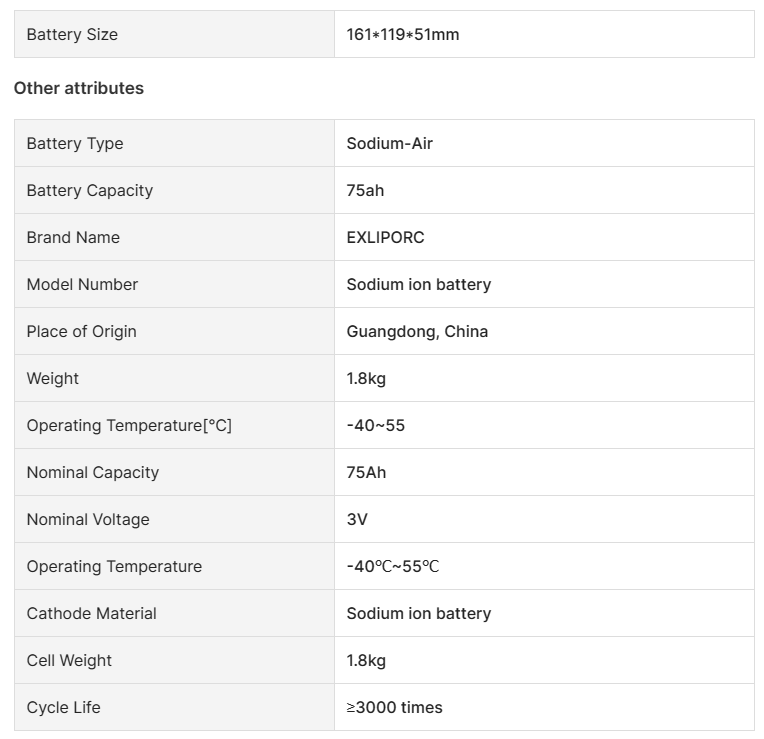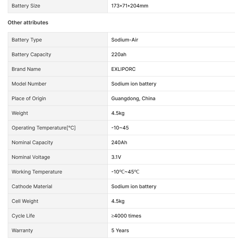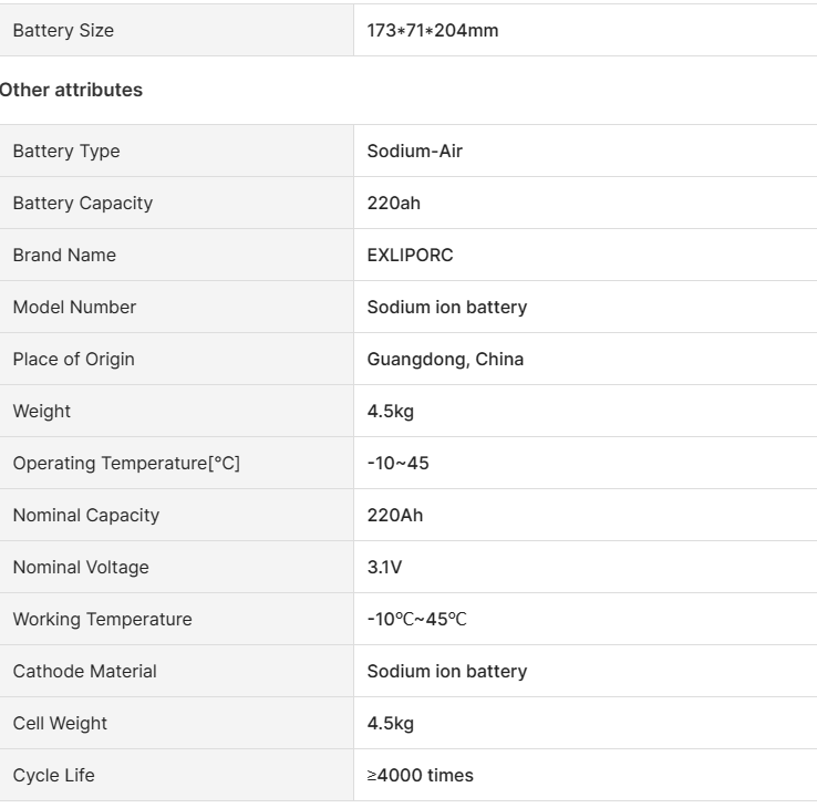Key attributes Industry-specific attributes Storage Type room temperature Anode Material LFP Application Home Appliances, BOATS, Golf Carts, Electric Bicycles/Scooters, Electric Power Systems, Solar Energy Storage Systems Other attributes Brand Name EXLIPORC Model Number REPT 280Ah Place of Origin Guangdong, China Weight 6kg The charging ratio 99% The discharge rate 99% Nominal Capacity 280Ah Nominal Voltage 3.2V Operating voltage 2.5-3.65V Working Temperature -30℃~55℃ Storage Temperature -30... -